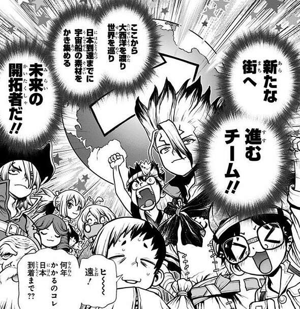 超合金の街を樹立し、超合金からロケットエンジン(LV.1)も完成させた千空とゼノですが、宇宙船を飛ばすためのロケットエンジンはさらに改良したLV.99のものが必要となります。そのため、千空やゼノ達はチームを3つに分けて、各々別の活動をすることになります。