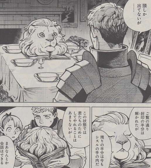 が、ライオスたちが驚いていたのは初めて有翼の獅子に会っただけではなく、頭のみしか出てきていなことも関係しています。封印は半分しか解かれておらず、残りの半分はシスルの手の内にあると、有翼の獅子は言います。