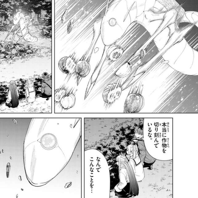 軍用ならかなり厄介な代物で、フリーレン達が慎重に様子を窺っていると、ゴーレムは作物を切り刻み始めます。