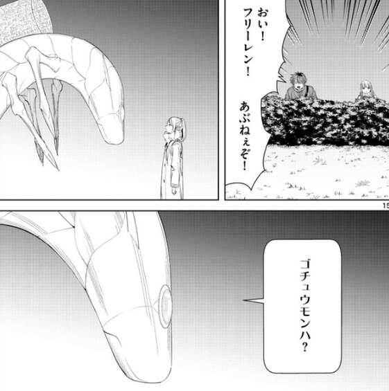 ゴーレムの様子を見ていたフリーレンは、なるほどそういうことか、とつぶやくと、ゴーレムに近づいていきます。シュタルクが危ないと叫びますが、ゴーレムに近づいたフリーレンにゴーレムは攻撃することなく、ゴチュウモンハ?と、ゴーレムが話しかけてきます。