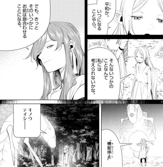 フリーレンはフランメとの思い出を振り返り、このゴーレムが作られた時の事を思い出します。兵器以外のゴーレムを作るだなんて珍しいね、とフリーレンはフランメに言いますが、フランメは、こういう奴らがいないと世界が平和になった時に困るだろ、と答えます。平和か いつになることやら、そんないつかのことなんて私には考えられないかな、とフリーレンは言いますが、きっとそのいつかにお前は居合わせることなる、とフランメはフリーレンに答えます。“機能停止”、とフリーレンがゴーレムに言うと、ゴーレムは、キノウテイシ、と答え動きを止めます。