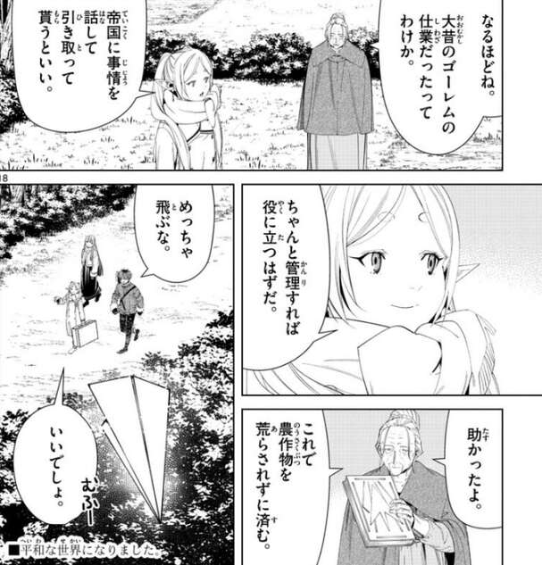 城塞都市ヴァイゼを抜けたフリーレン達は、帝国領近くの農村で作物を荒らす魔物の退治を依頼されます。その魔物は野菜を切り刻んだり、家畜や野生動物を殺したりするようですが、村人には手を出さないようです。結局、その魔物はゴーレムで、昔にフランメが調理用に作ったものでした。フリーレンはフランメとの思い出を振り返りつつ、手に入れた魔導書で作った紙飛行機を飛ばし、平和な時代を満喫します。