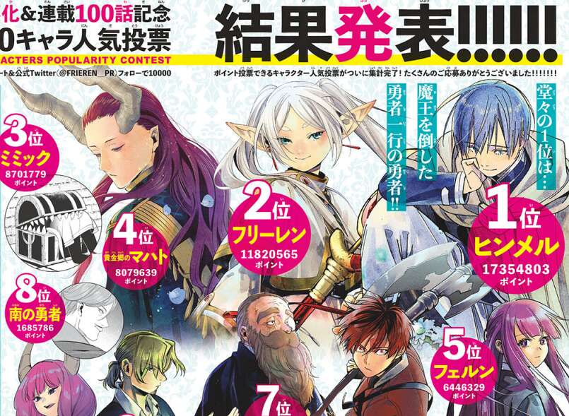 アニメ化記念人気投票結果が発表されています。1位ヒンメル、2位フリーレンはいいとして、何故か3位にフリーレンをくったミミックが入っています…。ミミック、人気ありますね。