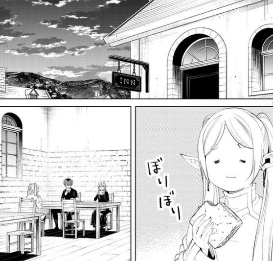 やっと北部高原を抜けれそうで、フリーレン達はこの辺りで宿を取ります。しかし、ここの村は硬いパンしかないようで、フリーレンが非常に残念な顔をしています。