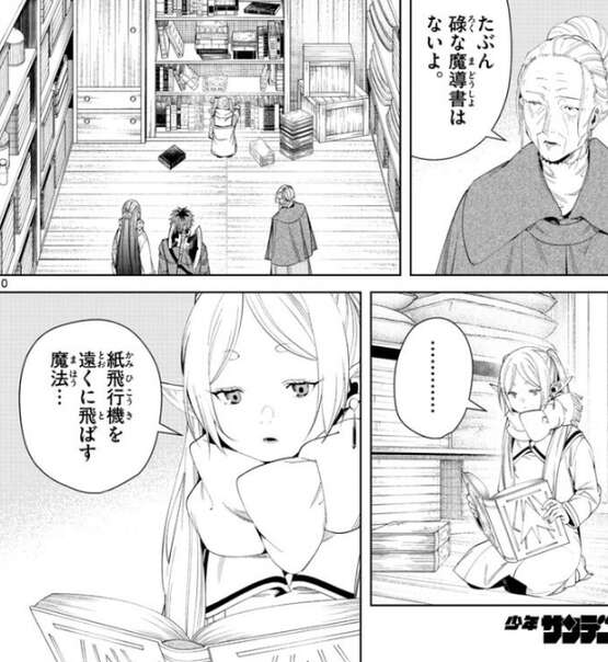 フリーレンは、引き受けるかどうかは報酬次第かな、と言い、この村の魔導書を調べます。すると、紙飛行機を遠くに飛ばす魔法の魔導書が見つかり、役に立たない魔法が大好きなフリーレンはこの魔導書を気に入り、依頼を引き受けます。