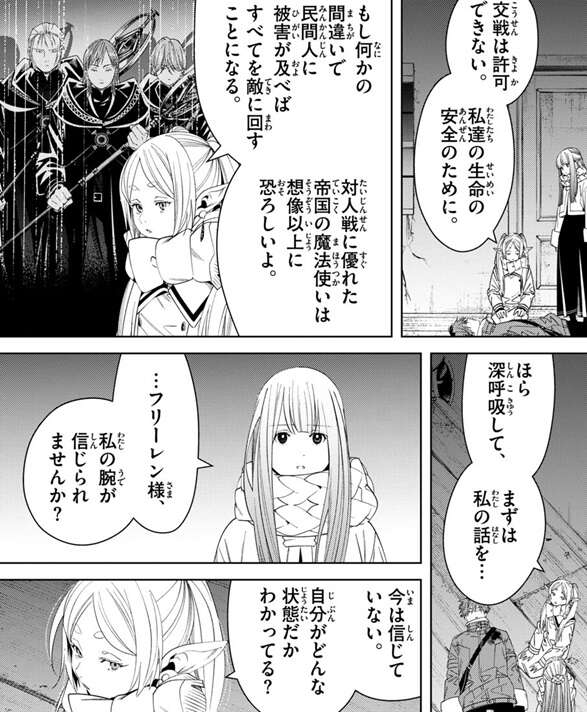 敵が解毒剤を持っている可能性をフェルンは言いますが、フリーレンは別の解決方法を探すように言います。フェルンはシュタルクが死ぬかもしれないと、敵と交戦しようとしますが、ここは帝都だから万が一民間人に被害が及べば全てを敵に回すことになる、とフリーレンはまず深呼吸するように言います。
