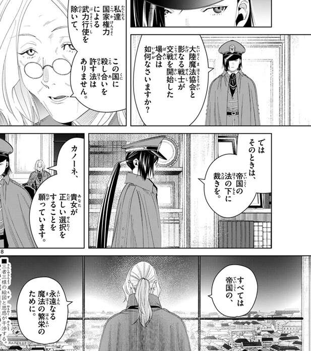 不測の事態の事をフラーゼが話すと、カノーネは、不測の事態をご所望ですか?と、フラーゼに聞きます。フラーゼは構わず、貴女には私に質問があるはずです、と聞くと、大陸魔法協会と影なる戦士が交戦を開始した場合は如何なさいますか?と、カノーネは質問します。殺し合いを許す方はありません、とフラーゼは答え、カノーネも、ではそのときは帝国の法の下に裁きを、と答えます。フラーゼはカノーネに、正しい選択をすることを願っています、と言い、すべては帝国の、永遠なる魔法の繁栄のために、とつぶやきますが、フラーゼの思惑はどこにあるのでしょうか?