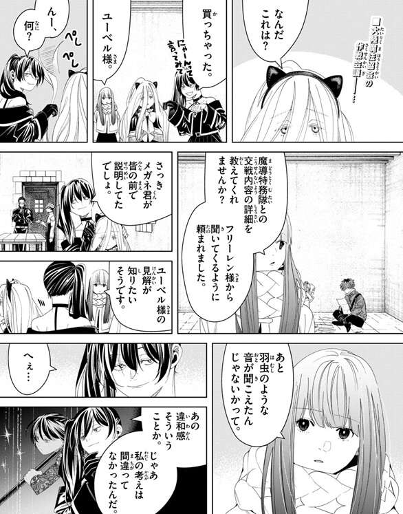 ユーベルは猫耳の魔道具を買ったようで、ゼンゼに魔道具を着せています。そこにフェルンが会話に入ってきて、魔導特務隊との交戦内容の詳細を聞いてきます。魔導特務隊との戦いの中で羽虫のような音が聞こえたんじゃないかと、フェルンは聞きユーベルも違和感があったと答えます。