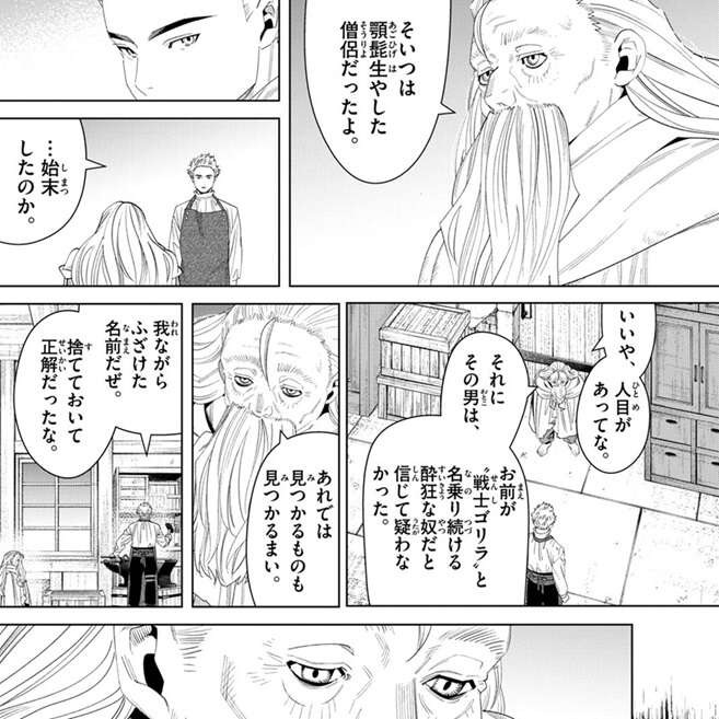 そいつは顎髭を生やした僧侶だったとヴァルロスがクライスに教えると、始末したのかと聞きます。人目があってザインは始末していないとヴァルロスは答えますが、お前が“戦士ゴリラ”と名乗り続ける酔狂な奴だと信じて疑わなかったと、ザインの事を教えます。ヴァルロスはザインが“戦士ゴリラ”を探していた時の事を思い出し、僧侶アゴヒゲと言っていた事もクライスに教えます。