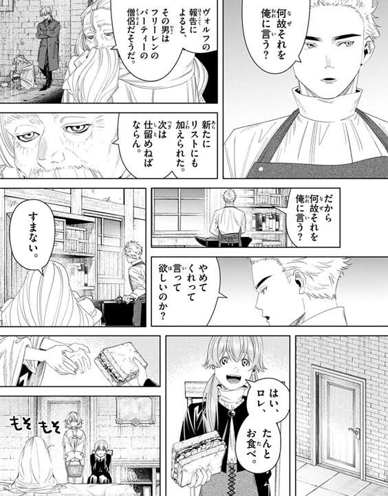 ヴァルロスはクライスにその僧侶はフリーレンのパーティーで、新たににリストに加えられた、と言いますが、クライスはあまり気にしていません。一方、フェルンにやられたロレはイーリスからサンドイッチを貰いますが、布団から出てきません。ロレは死んでいないようですが、戦線復帰するのは時間がかかりそうです。しかしクレマティスは冷酷の人間なようで、他の人間を任務を遂行するための駒としてしか見ておらず、ロレを無理やり戦線復帰させるかもしれません。