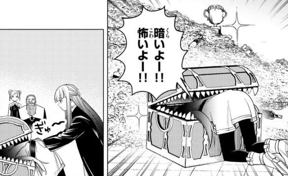 フリーレンは大きな宝箱を見て我慢できなかったようで、早速宝箱を開けています。しかし、その宝箱はミミックでフリーレンは喰われてしまい、暗いよー!!怖いよー!!と、フェルンに助けを求めます。第二次試験でミミックに喰われるのは、48話に続き2回目で、フェルンもあきれたのか、フリーレンをぎゅ~とミミックに押し込んでいます。もしくは49話でフリーレンから教わった通り、ミミックがオエッとなるように押し込んでいるのかもしれません。