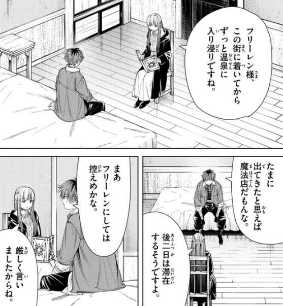 勇者ヒンメルの死から29年後、北側諸国、城塞都市ハイスに到着したフリーレンは、この街の温泉にずっと入り浸っています。たまに出てきたと思えば魔法店に寄っているようで、後二日もこんな感じで滞在するようです。