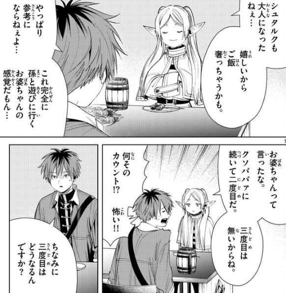 そんなフリーレンの態度に半信半疑ながらも、オレに“デートしよう”と言われたらどう思うか?と、シュタルクは相談します。フリーレンの答えは、シュタルクも大人になったねぇ…、嬉しいからご飯奢っちゃうかも、と孫と遊びに行くお婆ちゃんのような事を言います。シュタルクのつぶやきに、お婆ちゃんって言ったな、クソババァに続いて二度目だ、三度目は無いからね、とフリーレンは怒り、前に言ったクソババァと合わせてしっかりカウントします。