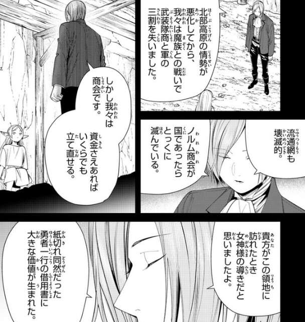 場面はフリーレンが鉱山に連れてこられたばかりの時に戻り、フリーレンはノルムと話をしています。フリーレンは、80年前当時、なんの期待もされていなかった勇者一行に無期限で資金を提供したノルム卿、その子孫からこんな仕打ちをくらうとは思わなかった、とノルムに言います。しかし、わざわざ鉱山まで訪ねてくるってことは何か考え合っての事だったのかな、とノルムに聞くと、北部高原の物流、酷い有様でしょう、とノルムはフリーレンに話しかけます。北部高原の情勢が悪化してから、ノルム商会は魔族との戦いで武装隊商と軍を三割失ったようで、物流網も壊滅的な被害を受けたようです。しかしノルムは、国であったらとっくに滅んでいるが、我々は商会なので資金さえあればいくらでも立て直せる、とフリーレンに言います。そしてこの鉱山は開発中のもので、銀鉱が見つかれば、勇者一行の借金など帳消しにして有り余るほどの莫大な利益が出る、フリーレン様ならそれを見つけるのも容易なはず、とノルムは言います。