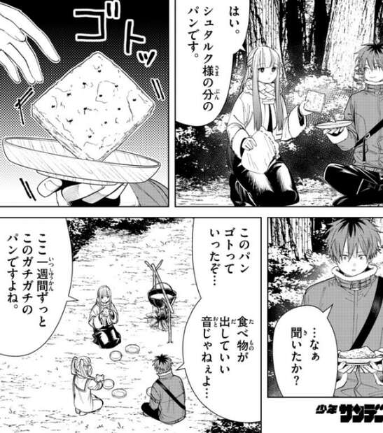 勇者ヒンメルの死から30年後、北側諸国、ノルム商会領でフリーレン達は野営をしていますが、シュタルクが出されたパンに文句を言っています。ここ一週間ずっと、ガチガチの硬いパンを食べているようですが、北部高原は穀倉地帯のビーア地方を除くと不毛の土地で、今は物資も流通していないようで、こんなパンでも仕方がないようです。