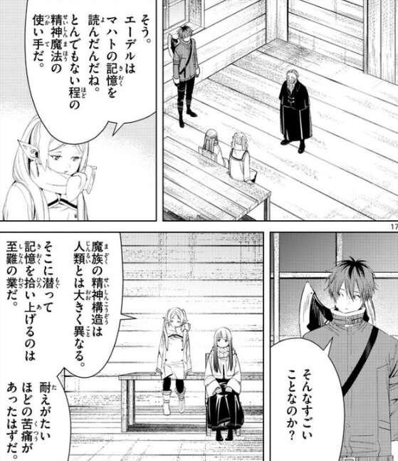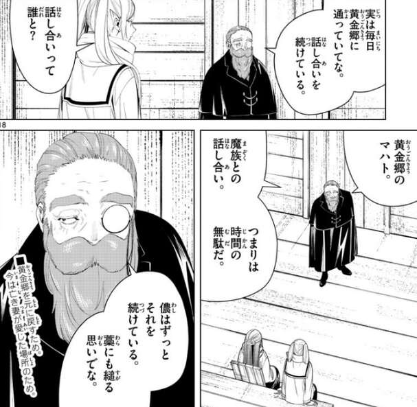 デンケンは日没になると、マハトの記憶についての説明が残っていますが、話を一旦終えます。デンケンは毎日、黄金郷に帰っていて話し合いを続けていると言います。話し合いって誰と?と、フリーレンが聞くと、黄金郷のマハト、とデンケンは答えます。魔族との話し合いだとデンケンは言いますが、それが時間の無駄だとデンケンも分かっているようでが、藁にも縋る思いでデンケンは続けていると言います。