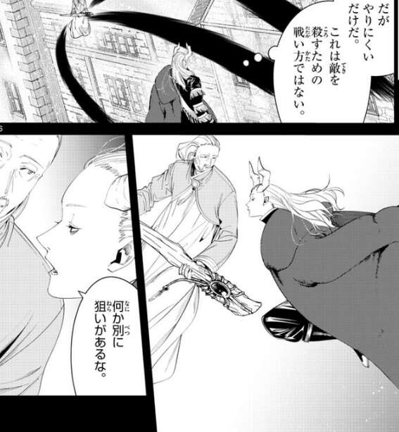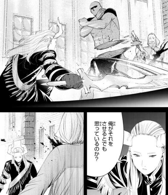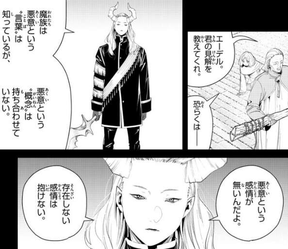 それを聞いていたマハトはエーデルが答えるより先に、魔族には悪意という“言葉”は知っているが、悪意という“概念”は持ち合わせていない、とレルネンに言います。悪意という感情が無いのだから、存在しない感情は抱けない、とマハトは冷静に言うと、次の作戦は決まったか?と、レルネンに訊ねて、再びレルネンを攻撃しようと黄金の剣を構えます。