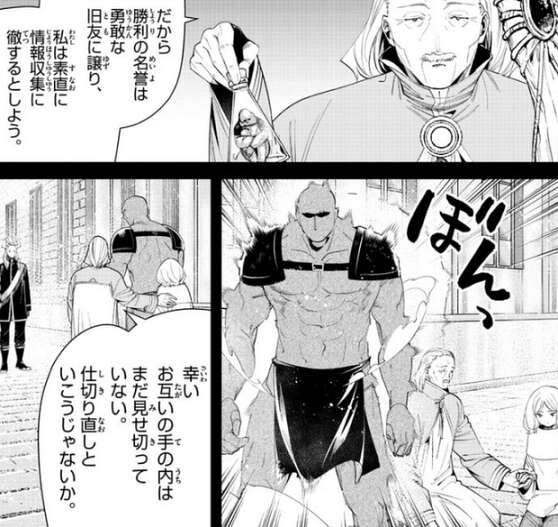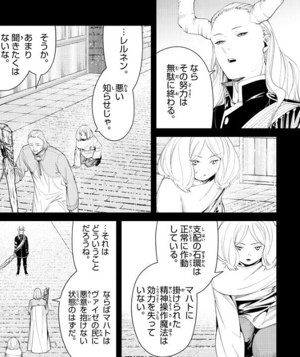 マハトは、ならその努力は無駄に終わる、とレルネン達に告げると、エーデルは悪い知らせがあるとレルネンに言います。支配の石環は正常に動作している、マハトに掛けられた精神操作魔法は効力を失っていない、とエーデルはレルネンに言いますが、なら何故城塞都市ヴァイゼを住民諸共黄金に変えている?と、レルネンは疑問を口にします。ヴァイゼの民を少しの悪意も抱かずに出来たとは考え難い、とレルネンは言いエーデルに意見を求めます。