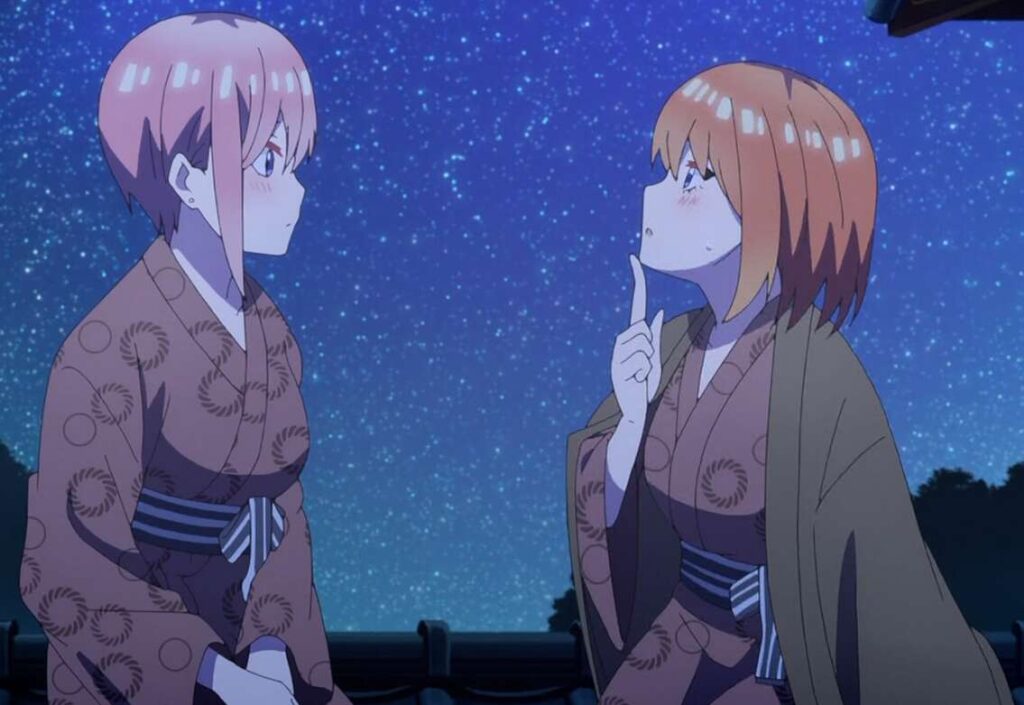 温泉にいる二乃は、一花に相手の名前は言わずに好きになった人がいると相談します。一花は二乃にネガティブな事を言いますが、二乃は一花のいうことを聞かず相手にキスをすると宣言します。