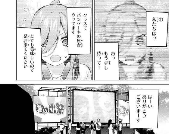学園祭 二日目の場面になり、パンケーキ屋には初日より明らかに人が増えてきます。そして二乃と五月の元に、風太郎と二乃のバイト先の店長が訪れます。隣には三玖のバイト先の店長もいます。退院した店長に五月が挨拶すると、五月の事を「M・A・Y」様とちゃんと認識しています。