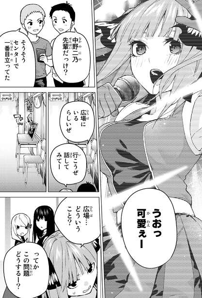 場面変わって、二乃が友達と脱出ゲームを楽しんでいます。何故か広場に二乃がいると噂が立ってしまい、男子生徒が広場に行こうと話をしています。恐らく、広場では二乃に変装した一花がいるのでしょう。