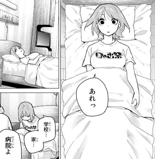 目が覚めた四葉は自分ではすぐには分かりませんでしたが、病院のベッドの上で寝ています。そばには二乃がいて、四葉に全然余裕持ってやれていないじゃないと言います。四葉は二乃に心配かけてごめんと謝った後、まだやり残したことがたくさんあるんだと、学園祭に戻ろうとします。
