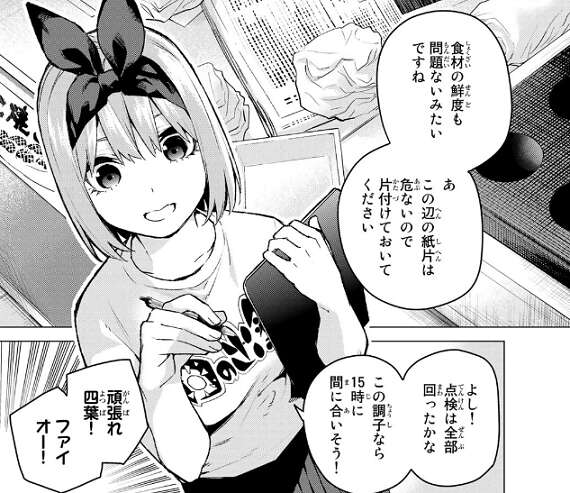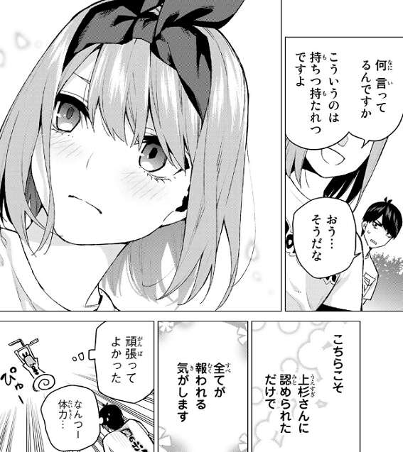 持ちつ持たれつだと言いつつ、四葉は頬を赤らめながら、風太郎に認められただけで、全てが報われた気がすると心の中で思います。四葉は頑張ってよかったとさらに頑張ります。その姿を見た風太郎は、なんつー体力と四葉の体力に驚きます。