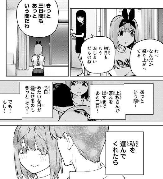 風太郎からも感謝されて、四葉は全てが報われたと喜び、最終日に私を選んでくれたらと妄想までしていましたが、自分のクラスのたこ焼き屋が火事を起こしたと知った時から状況が変わります。自分を追い込むようにお手伝いを増やしていき、最後は倒れて病院に運ばれています。しかし、竹林と会った後何があったか今回は描かれていませんが、竹林とのやり取りも気になります。