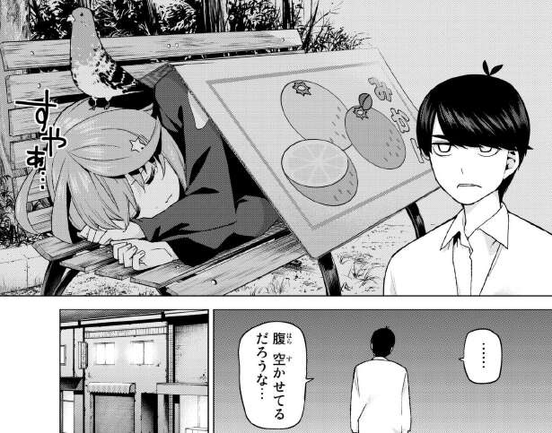 結局二乃にホテルのフロントに通報されてしまい、一旦撤退します。二乃の居場所は分かり無事ホテルにいる事も判明したので、次は五月です。しかし五月は家に財布を忘れていて一文無しの状態です。腹を空かせているだろうなと、心配する風太郎です。