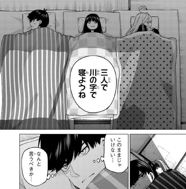 そのまま上杉家で入浴して、風太郎、らいは、五月の三人で川の字で寝る事になります。このままじゃいけないと強く思う風太郎です。