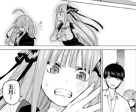 あの後、二乃と五月の喧嘩がエスカレートします。五月は風太郎が作った問題集を粗末に扱った事を、風太郎に謝る事を要求します。三玖は風太郎が作った問題集は全て手書きで、五つ子全員真剣に取り組むべきだと言います。
