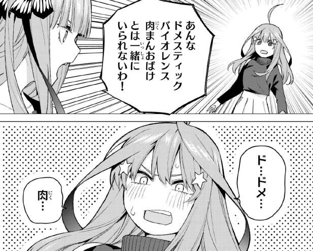 また五月が未練がましく母親の代わりを演じていると言われます。このセリフも気になります。一花と四葉は話し合おうと言いますが、「ドメスティックバイオレンス肉まんおばけ」のセリフに、五月がキレてしまい結局話し合いになりませんでした。