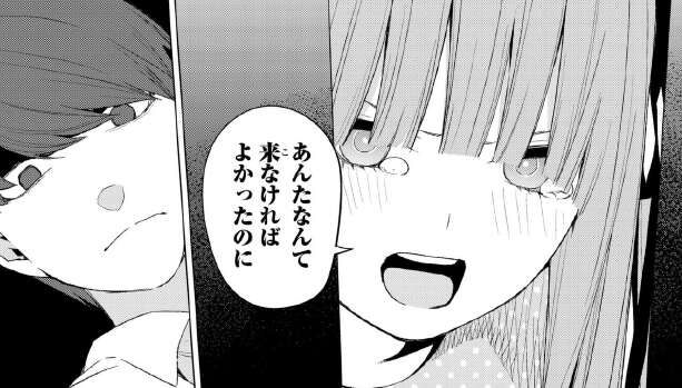 二乃に部屋から追い出されそうになる風太郎は、二乃に誰よりも五つ子とあの家が好きだったはずだと言いますが、二乃からこうなったのは全部風太郎のせいだと責められます。「あんななんて来なければよかったのに」とまで二乃に言われてしまいます。