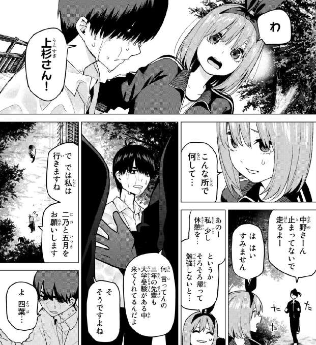 池から上がったもののずぶ濡れの風太郎は偶然、四葉と会います。四葉は部活の手伝いで一緒にランニングしているようです。四葉は試験勉強をしたがっているようですが、大学受験がある先輩も練習に参加している事を言われると、あっさりと諦めてしまいます。四葉、押しに弱すぎます。結局そのまま練習の続きで走っていてしまう四葉を、風太郎は引き留められませんでした。
