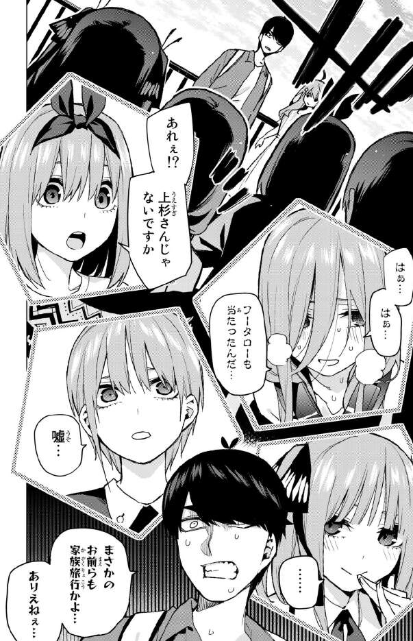 結局、風太郎は春休みにじっくり考えようと思い、春休みを迎えます。そして豪華賞品の旅行ペアチケットが、上杉家一家にあたったようです。上杉家、全員で家族旅行です。ちなみに1人分は自腹だそうです。