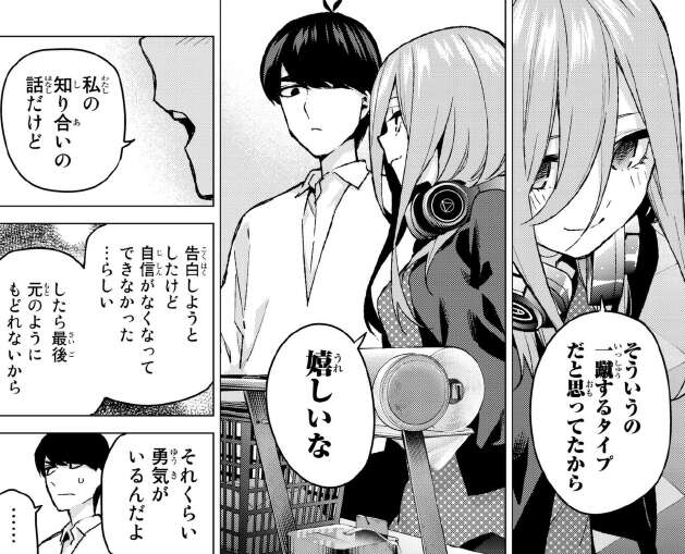 三玖も知り合いの話として、告白しようとしたけど自身がなくなってできなかった、したら元のように戻れないから、それだけ勇気がいるからと言い、自分はなんて憶病なのだろうと思います。