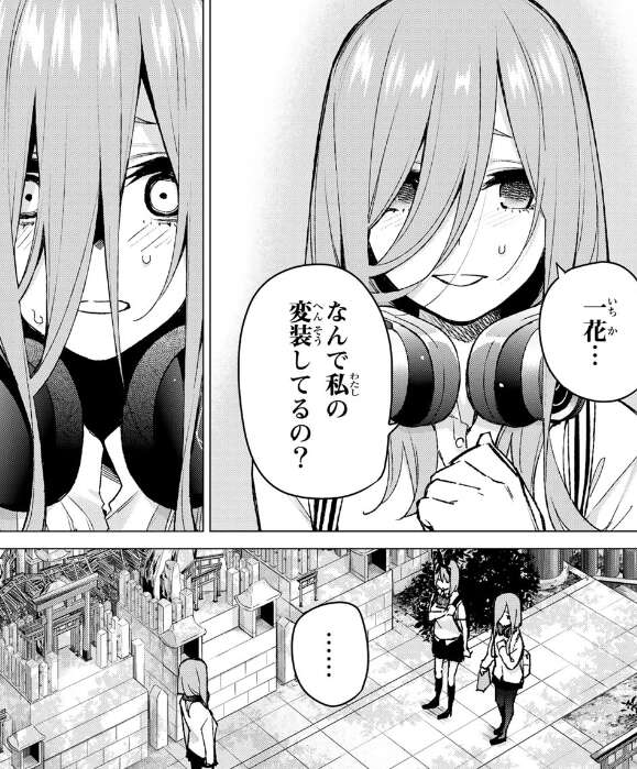 事態がのみ込めないようで三玖は一花に、なんで自分に変装しているのか質問します。しかし答えは返ってこず戸惑っている三玖を遮り、四葉が一花に話しかけます。