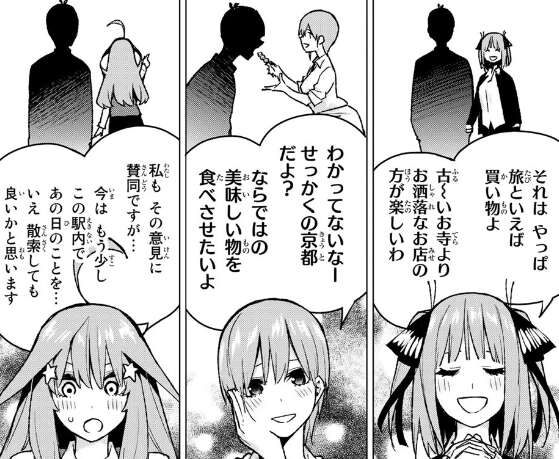 風太郎の班が出発すると、二乃の掛け声で全員ついて行きます。風太郎の班は、普通に京都の名所をまわっているようです。風太郎の班の移動に合わせて、五つ子たちも移動しつつ観光しています。三玖と四葉は、自由昼食で風太郎と二人きりになれるタイミングを探っています。