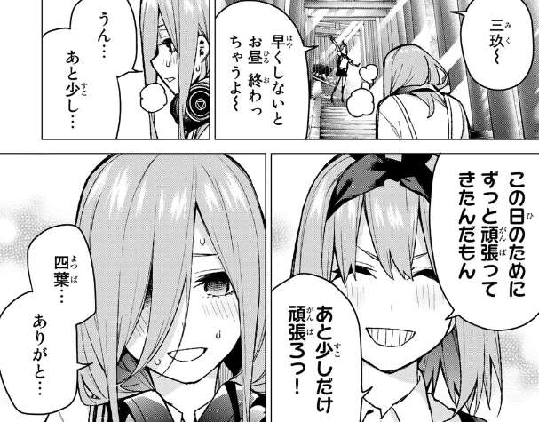 しかし、四葉はそんなつもりで言ったんじゃない、それが一花の本当にしたかったこと?と一花を責めます。四葉は三玖に、一花が邪魔をしようとしていると言い、ばらそうとしますが誰かが階段を上ってきている事に気付いた三玖一花は、四葉を止めようとします(追記:コメント欄で教えてもらいましたが、状況から見て三玖は階段を背にして登ってきている風太郎が見えない等の理由で、四葉を止めようとしたのは三玖ではなく、三玖に変装した一花の方のようです)。