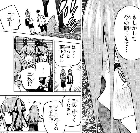 前回、三玖に変装した一花が、三玖と四葉に鉢合わせしてしまい、さらにそのタイミングで風太郎にも会ってしまいました。風太郎に自分が告白しようとしている事がバレてしまい、その場を走って去ってしまう三玖です。
