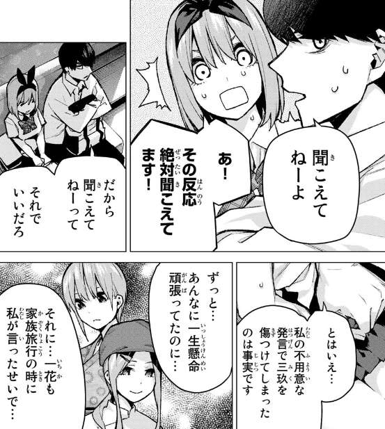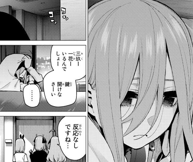 二乃達は部屋の扉の前で、三玖と一花に鍵を開けるように呼びかけますが、部屋の中に一花はおらず、三玖はひどい顔をしたまま無反応です。四葉もまだ修学旅行は二日あるので、これから自分に取り戻させて欲しいと語り掛けますが、四葉は何も悪くないと心の中で三玖は呟きます。