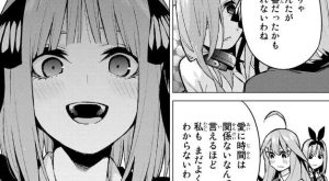 そして三玖の事で責任を感じている四葉に、人に気を遣いすぎると注意します。しかし、四葉以前の学校で自分が落第した時、他の四人が付いてきてくれた事を気にして、は姉妹の皆が自分より幸せになるのは当然だというのが、四葉の考えです。四葉は皆が幸せになる方法はないんでしょうかと言いますが、風太郎は現実的には難しい何かを選ぶときは、何かを選ばない時、いつかは決めなくちゃいけない人来ると言います。