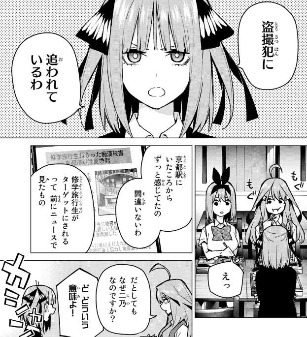 結局誰も三玖には会えず、二乃達はホテルで食事をしています。そこで二乃は盗撮犯に追われている、京都駅の頃から感じていたと言います。四葉と五月は信じず、話を三玖と一花に戻してもう一度部屋に確認しに行こうと言います。