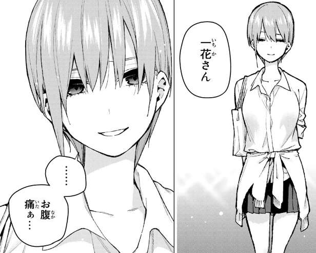 風太郎にはたいしたことないと言ってごまかしますが、このままでは誰も風太郎と二人きりになる機会が無くなってしまうと言います。五つ子たち、誰の目的も叶わなくなることは、望むところではないはずだと一花は言い、ある提案をします。