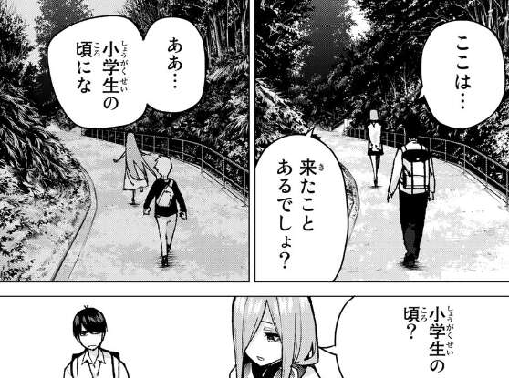 三玖に扮した一花に呼び出された風太郎は、二人で写真の女の子、零奈と小学生の頃に散策した場所を一緒に歩きます。風太郎は小学校の頃の、零奈に振り回された記録を思い出し、彼女との旅を一花に話します。