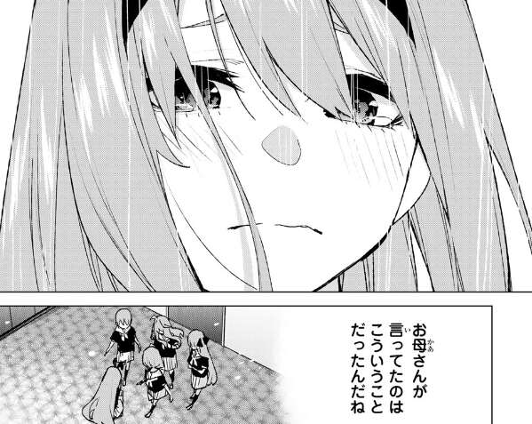 父親から試験を通過したはずだから転校する必要はないと言われますが、二乃はカンニングしたおかげで試験に通過できたと言い、一花、三玖、五月も同じくカンニングペーパーを見せて自分達もだと言います。四葉はなんで私のためにと驚きますが、四人はどこに行くにしてもみんな一緒がお母さんの教えだと言い、私たちは五等分だから困難も五人でなら乗り越えられるよ、と三玖は四葉に優しく言います。