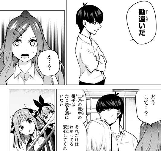 二乃は面倒を回避しようと別の方向に歩いて行こうとしますが、3人は風太郎と話しています。二乃が男子組の中にいて媚びを売っているのは、男子の誰かを狙っているに違いないという内容でした。しかし、風太郎は勘違いだと断言したこ焼き派の中に、二乃の意中の相手はいないから安心するようにクラスメイトの女子に話します。