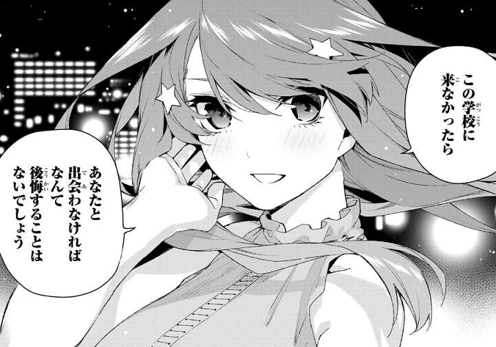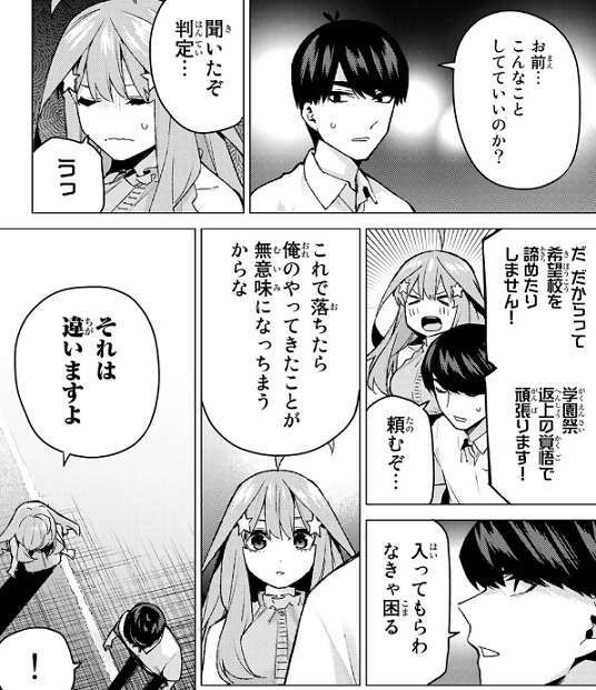 風太郎はこれで落ちたらやってきたことが無意味になると言いますが、それは違うと五月は否定します。女優の道を目指した一花や、調理師を目指した三玖は最終的に大学の道に進みませんでしたが、二人との時間は無意味だったかと聞かれ、そうは思いたくないと風太郎は答えます。私たちの関係は既に家庭教師と生徒という枠だけでは語れないと言い、たとえこの先失敗したとしても、あなたと出会わなければと後悔することはないでしょうと言います。