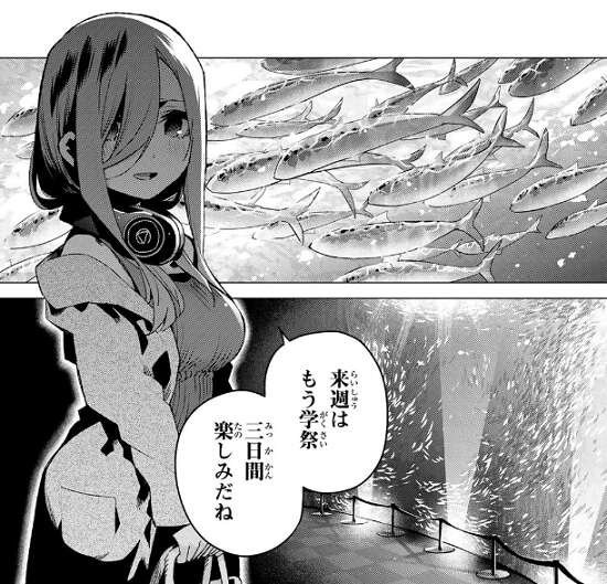 場面変わって、学校で三玖が日曜日に一緒にお出かけしようと風太郎を誘います。場所は水族館ですが、風太郎は学園祭でたこ焼きとパンケーキ二つともやることになった事を思い出して、複雑な表情をうかべます。三玖はそれだけ皆真剣なんだと言い、風太郎にも当日は食べに来てと誘います。