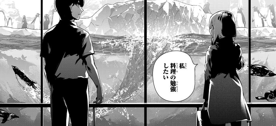 見ていた五匹のペンギンが偶然、姉妹のペンギンで三玖や風太郎はペンギンに、二乃や三玖を重ねて楽しみます。三玖はペンギンを見ながら、調理学校に行きたいと言いづらくなってしまったが、ひとまず大学に行ってからでも遅くないかもと考え始めます。風太郎と同じ大学行けるかも知れないと考えながら、風太郎を見つめていますがなかなか飛び込めなかったペンギンが、水に飛び込んだと同時に三玖も正直に自分の気持ちを話します。
